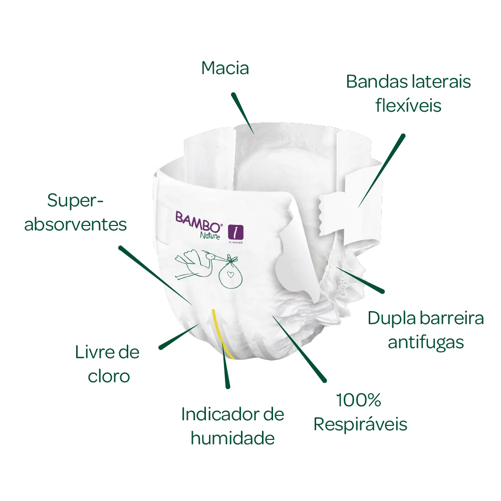 As fraldas ecológicas Bambo Nature T1 foram desenvolvidas especialmente para recém nascidos entre 2 e 4 kg, oferecendo proteção eficaz, suavidade e segurança desde os primeiros dias de vida.